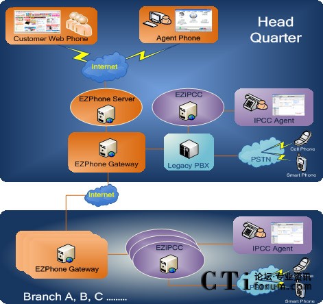 注釋:此拓?fù)鋱D中涉及的EZPhone system是EZ系列多媒體呼叫中心系統(tǒng),我們會(huì)在正式GA后,通過SOPHO市場(chǎng)部第一時(shí)間向大家宣布!