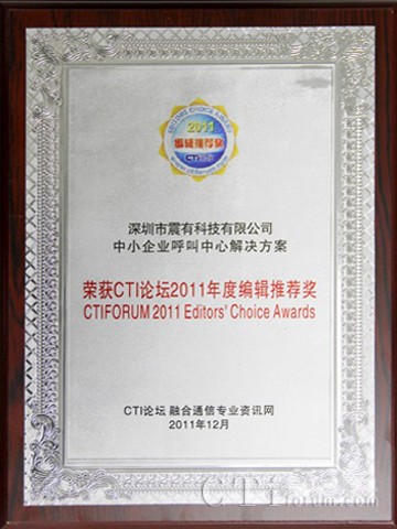 CTI論壇(ctiforum)12月26日消息(記者 張潔): 近日,由CTI論壇主辦的2011年度“編輯推薦獎”評選結(jié)果正式揭曉,深圳市震有科技有限公司憑借自主研發(fā)的產(chǎn)品和解決方案榮獲CTI論壇2011年度最佳編輯獎《中小企業(yè)呼叫中心解決方案》。