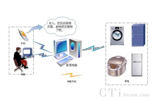 家電遠控系統(tǒng)的原理是利用電腦或者手機的電源管理系統(tǒng),來管理用戶終端軟件管理電源的開關、定時、預設時間等,利用互聯(lián)網(wǎng)或者手機網(wǎng)絡把信號傳輸?shù)郊彝ル娔X,家庭電腦當作小型服務器或者信號轉(zhuǎn)發(fā)點,把信號利用藍牙、zigbee、wifi等無線傳輸?shù)街付ǖ碾娫床遄,當然每個電源插座都要有相應的信號接收模塊實現(xiàn)和家庭電腦的信號傳輸,實現(xiàn)了對電源的管理功能。家電遠控終端軟件嵌入語音合成軟件,利用合成語音報讀預設的提醒內(nèi)容和時間提醒,具有危急情況下的報警功能。當然如果我們是在家里,可以直接用手機通過藍牙對電源插座進行管理,或者通過家庭電腦進行管理。如圖所示: