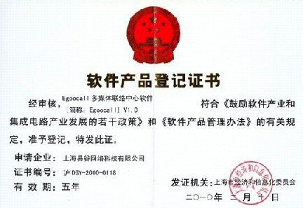 CTI論壇(ctiforum)3月8日消息(記者 袁青): 由易谷網(wǎng)絡(luò)自行研發(fā)的“Egoocall多媒體聯(lián)絡(luò)中心軟件”,于2010年2月10日通過上海市經(jīng)濟(jì)和信息化委員會審核,獲頒“軟件產(chǎn)品登記證書”。(證書號:滬DGY-2010-0118)