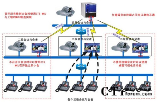 此方案由于使用了簡單而廉價的CTS軟件MCU,讓3級會議與會者接入CTS MCU,然后由CTS MCU再與上級總的MCU做級連,從而省去了在原來總部MCU端增加與會者數量許可的價格。