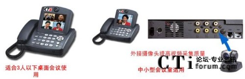 方案中采用的終端為CTS的可視電話終端,該可視電話適合于1-3人的桌面會議,自帶5寸的屏幕,不用額外連接電視機,特別適合于縣級鄉(xiāng)級等底等級的機構使用。同時可視電話可以外接入清晰的攝像頭,滿足5-10人小會場對于視頻的清晰度要求。
