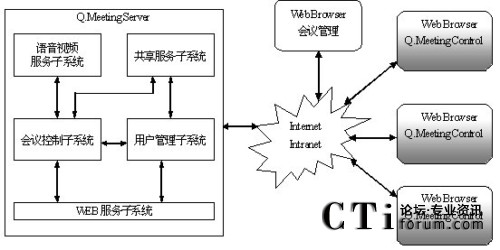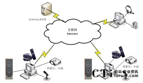系統(tǒng)選用北京億方連線通訊技術(shù)有限公司具有國際先進水平的全新第四代網(wǎng)絡視頻協(xié)作會議中心Q.Meeting為核心進行構(gòu)建,該系統(tǒng)由會議服務器Q.Meeting Server和基于IE 瀏覽器的客戶端組成。Q.Meeting Server運行于一臺服務器上,構(gòu)成網(wǎng)絡會議中心,提供會議控制、視頻服務、語音服務、共享服務、WEB服務和會議用戶管理等功能。所有參加會議的人員只需通過IE瀏覽器訪問會議中心網(wǎng)站就可以參加會議,通過訪問會議頁面和嵌于其中的客戶端插件Q.Meeting Control實現(xiàn)音頻和數(shù)據(jù)共享等交流。