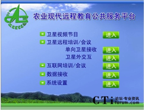會(huì)議所使用的農(nóng)業(yè)現(xiàn)代遠(yuǎn)程教育平臺(tái)將先進(jìn)的多媒體寬帶DVB衛(wèi)星通信系統(tǒng)和全面的網(wǎng)絡(luò)遠(yuǎn)程教育培訓(xùn)/會(huì)議系統(tǒng),天(衛(wèi)星網(wǎng))地(互聯(lián)網(wǎng))合一,集成廣播、電視和網(wǎng)絡(luò)的功能,形成了廣覆蓋、大容量、多功能、低成本、快捷高效的遠(yuǎn)程教育培訓(xùn)網(wǎng)絡(luò)、技術(shù)培訓(xùn)資源傳輸通道和網(wǎng)絡(luò)視頻會(huì)議系統(tǒng),是面向“三農(nóng)”開展多形式多層次現(xiàn)代遠(yuǎn)程教育培訓(xùn)、科學(xué)普及、技術(shù)推廣和信息傳播的公共服務(wù)平臺(tái)。該平臺(tái)包括:單向廣播式衛(wèi)星直播系統(tǒng)、雙向衛(wèi)星交互式培訓(xùn)/會(huì)議系統(tǒng)、衛(wèi)星外交互培訓(xùn)/會(huì)議系統(tǒng)(衛(wèi)星接收,互聯(lián)網(wǎng)回傳)和地面互聯(lián)網(wǎng)雙向交互培訓(xùn)/會(huì)議系統(tǒng),適用于純衛(wèi)星網(wǎng)絡(luò)和衛(wèi)星網(wǎng)、互聯(lián)網(wǎng)混合接入等各種網(wǎng)絡(luò)環(huán)境。