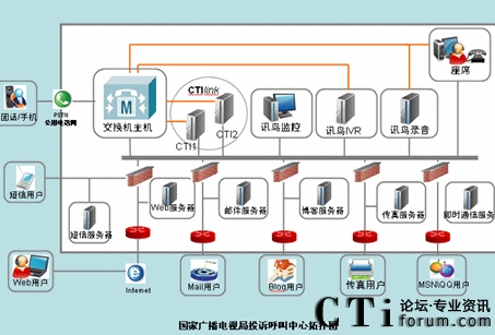 系統(tǒng)主要包含IVR服務(wù)器,CTI服務(wù)器,短信網(wǎng)關(guān),郵件服務(wù)器,傳真服務(wù)器,數(shù)據(jù)庫(kù)服務(wù)器,座席系統(tǒng)等。客戶撥打特服號(hào)碼接入廣電公司客服系統(tǒng),首先由IVR提供自動(dòng)語(yǔ)音服務(wù)。CTI服務(wù)器負(fù)責(zé)所有的電話的路由、排隊(duì)、轉(zhuǎn)接和控制。客戶在接受自動(dòng)語(yǔ)音服務(wù)時(shí),如果需要人工幫助,可選擇轉(zhuǎn)入人工座席。由IVR系統(tǒng)向CTI發(fā)出轉(zhuǎn)接請(qǐng)求,完成轉(zhuǎn)接功能。