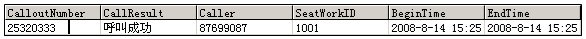 當座席E1呼入時, 接收主叫號碼(87699078), 同時發(fā)出呼叫(主叫號碼為87699078,被叫為25320333),并通過預(yù)測撥號識別各類呼叫結(jié)果,如:忙音、空號、或無人接聽等,只將有效的通話轉(zhuǎn)接至業(yè)務(wù)人員,同時將呼叫結(jié)果寫入數(shù)據(jù)庫UT_IMCALL表(如下圖),