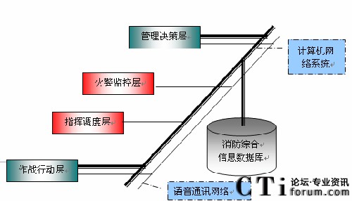 通過對(duì)消防安全監(jiān)控指揮中心業(yè)務(wù)的分析,引進(jìn)先進(jìn)的數(shù)據(jù)通信網(wǎng)絡(luò)和語(yǔ)音通訊網(wǎng)絡(luò),我們可以將未來的消防業(yè)務(wù)層次抽象地概括為四層(如圖所示):管理決策層、火警監(jiān)測(cè)層、指揮調(diào)度層和作戰(zhàn)行動(dòng)層。與管理決策層對(duì)應(yīng)的組織機(jī)構(gòu)為消防通信指揮中心;與火警檢測(cè)層、指揮調(diào)度層對(duì)應(yīng)包括消防指揮中心的接處警子系統(tǒng)、指揮調(diào)度等子系統(tǒng);與作戰(zhàn)行動(dòng)層對(duì)應(yīng)的組織機(jī)構(gòu)為消防站(消防隊(duì))和消防車及消防隊(duì)員。