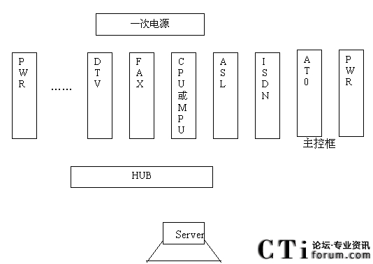 - CPU為256路主控板,對整個系統(tǒng)進行主控,為整個系統(tǒng)提供時鐘入同步信號及交換網(wǎng),含一個10Base-T以太網(wǎng)口,通過HUB與Server進行控制信息的交互