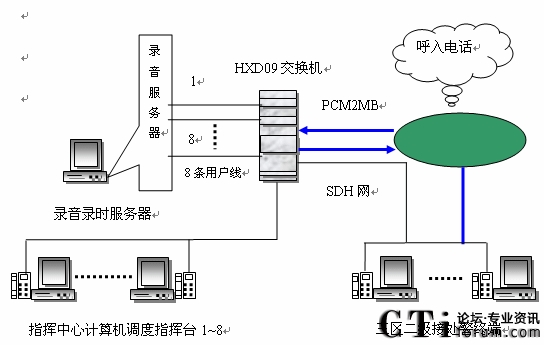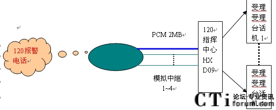 系統(tǒng)共包含4個E1,其中一個為公網(wǎng)呼入提供接口,另外三個可分別接入110、122(或120、119)。