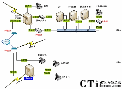 根據(jù)上述需求,我公司提出了電信PSTN網(wǎng)與IP網(wǎng)結(jié)合的IP語音解決方案,單位內(nèi)部呼叫采用IP網(wǎng)絡(luò),而對外呼出采用電信PSTN網(wǎng)絡(luò)。這套方案兩個主要原則:第一,最佳化地利用現(xiàn)有網(wǎng)絡(luò)資源,最大化地節(jié)省通話費用;第二與現(xiàn)有電信電話交換網(wǎng)絡(luò)實現(xiàn)無縫連接,即電信PSTN呼入后,可以任意的轉(zhuǎn)接到本地分機或IP分機,實現(xiàn)PSTN與IP網(wǎng)的平滑聯(lián)結(jié)。因此部署實施這個方案中,關(guān)鍵是內(nèi)部IP網(wǎng)絡(luò)保持暢通,以滿足高質(zhì)量的IP話務(wù)。