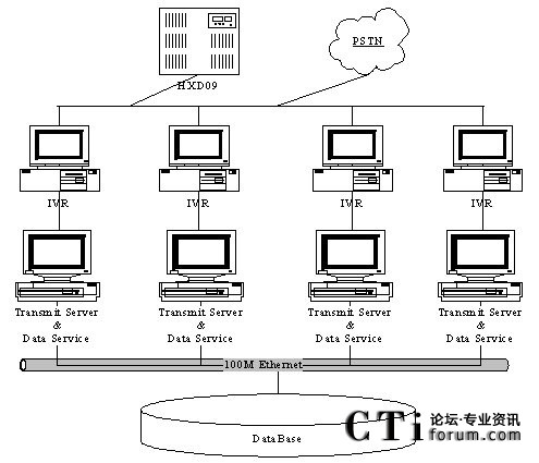 系統(tǒng)硬件的兩大部分通過(guò)100M局域網(wǎng)連接起來(lái),以語(yǔ)音接入處理部分為聯(lián)系手段、以數(shù)據(jù)處理部分為信息處理平臺(tái),相互配合、有機(jī)結(jié)合,為廣大運(yùn)營(yíng)商通信用戶提供方便、可靠的自動(dòng)繳費(fèi)服務(wù)。