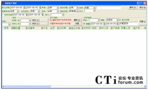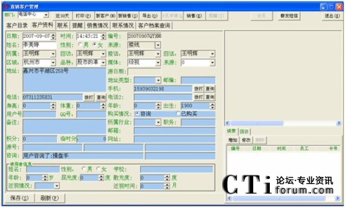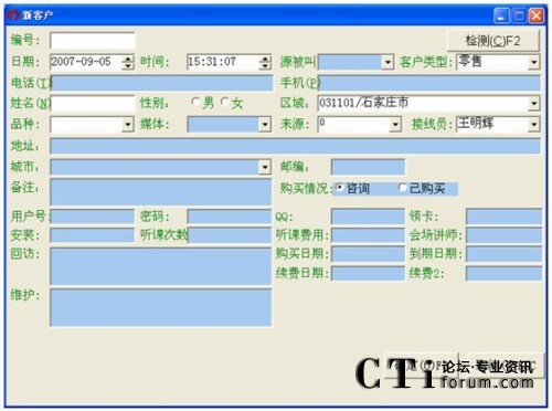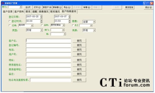 注:對于登記日期一直到客戶名這一段條件的查詢(即上圖中所有的那些查詢條件),都得點擊客戶名欄對應(yīng)的那個查找按鈕才能進(jìn)行有效的查找,否則若點擊其它按鈕(姓名電話直接檢索對應(yīng)的查找除外),都會提示“請輸入****”這種錯誤信息。而點擊最后一個查找,也是無效的,會轉(zhuǎn)到客戶管理中空白信息欄(即什么也查不到)。