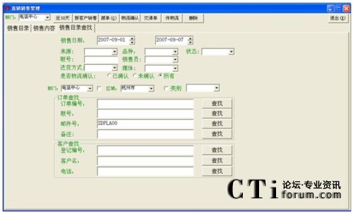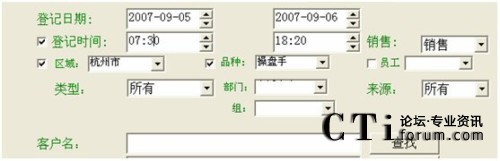例子:查找2007年9月5日到2007年9月6日間,登記時間為早上7:30到晚上18:20,購買了操盤手軟件的杭州市顧客的查找設(shè)置如下: