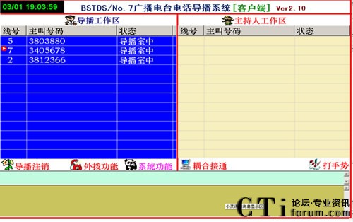 1、直播節(jié)目開播時,參與者打進電話,由導(dǎo)播把參與電話導(dǎo)入直播區(qū),這時直播區(qū)顯示參與者的電話號碼,主持人可以任意的選擇參與者進行通話或掛機。