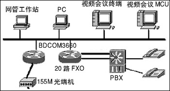 通過(guò)在BDCOM3660路由器上配置相應(yīng)的CE1、語(yǔ)音等功能模塊,中心20個(gè)E1接口可通過(guò)SDH連接17個(gè)地市氣象局和重要的氣象站(共20個(gè)),同時(shí)可供20部電話用以VoIP通話;中心BDCOM3660路由器每臺(tái)配兩個(gè)10/100M以太網(wǎng)端口,使得數(shù)據(jù)和視頻分開(kāi),防止網(wǎng)絡(luò)的廣播風(fēng)暴。