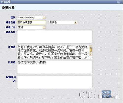 添加功能用來添加新問卷,這里你可以根據(jù)業(yè)務的需要設定所需要得信息,例如問卷的歡迎語,結束語,配額提示語等信息,自定義輸入信息。