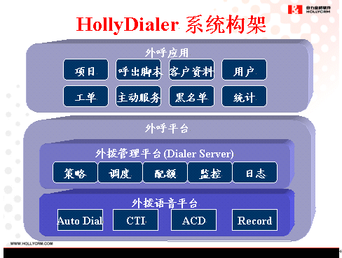 HollyDialer是HOLLYCRM(合力金橋軟件)公司自主開發(fā)的外撥業(yè)務(wù)綜合平臺,作為HollyC6呼叫中心系統(tǒng)的增值軟件,HollyDialer主要圍繞客戶實現(xiàn)相關(guān)的主動服務(wù),完成市場調(diào)查、客戶回訪、電話營銷等多種類型的外撥任務(wù)。外撥設(shè)備支持多種主流交換平臺的無縫集成,能夠靈活定制自動、人工外撥策略,實現(xiàn)預(yù)覽式、預(yù)測式、多種智能外撥模式,為企業(yè)建設(shè)盈利型的呼叫中心提供了最為便捷的工具,