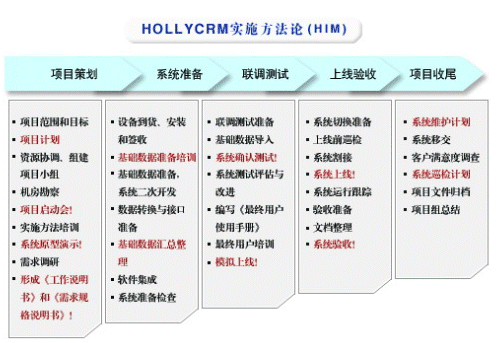 HOLLYCRM(合力金橋軟件)公司是國內(nèi)最早從事呼叫中心應(yīng)用軟件開發(fā)與服務(wù)公司,在多年的實踐經(jīng)驗基礎(chǔ)上形成了完整的“456”呼叫中心“項目實施方法論”(HIM:HOLLYCRM Implementary Methodology),即“四大實施策略、五個項目階段、六大管理專題”。該體系的有效運(yùn)行對公司項目的成功上線和推進(jìn)軟件產(chǎn)品的成熟將起到至關(guān)重要的作用。
