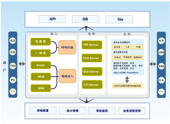 HollyC&C不僅支持電話、傳真、短信、Email、Web多媒體溝通渠道的統(tǒng)一接入和管理,還具有強(qiáng)大的業(yè)務(wù)整合接口,能夠幫助企業(yè)實現(xiàn)呼叫中心與企業(yè)其它信息系統(tǒng):如辦公OA、ERP、SCM、財務(wù)等系統(tǒng)的接口和工作流程整合。