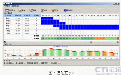 引入呼叫中心排班系統(tǒng)是提升坐席資源利用率的有效解決方案,排班系統(tǒng)可以對大量的歷史呼叫數(shù)據(jù)進行分析,并剔除特殊事件對呼叫量的影響,從而得出呼叫量變化的規(guī)律曲線,再輔助對特殊預(yù)期事件影響度的疊加,可以對未來一定時間的呼叫量變化做出比較客觀的預(yù)測(圖2)。在預(yù)測話務(wù)量變化曲線的同時,結(jié)合人員技能和班次設(shè)定,給出高擬合度的人工排班方案(圖3)。更為重要的是,成熟排班系統(tǒng)提供的話務(wù)預(yù)測模型多具備學(xué)習能力,能夠?qū)㈩A(yù)測的話務(wù)數(shù)據(jù)與實際話務(wù)數(shù)據(jù)進行對比,從而不斷提高話務(wù)預(yù)測模型的預(yù)測精度。成熟排班工具可以在保持呼叫中心同等服務(wù)水平的前提下,降低人工坐席代表的投入數(shù)量,進而釋放部分人工資源開展其它業(yè)務(wù)。