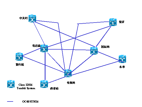 北京電信公眾IP網(wǎng)的骨干節(jié)點構(gòu)成的骨干網(wǎng)拓?fù)淝闆r如圖:
