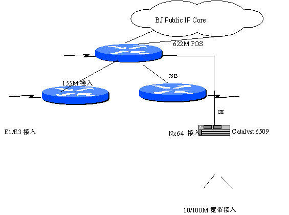 北京電信公眾IP網(wǎng)中,骨干網(wǎng)核心節(jié)點路由器為業(yè)界最 先進(jìn)的新一代電信級高性能的路由交換機 Cisco GSR 12016太比特系統(tǒng); 邊緣節(jié)點路由器為GSR 12008,Cisco 7513;10/100M局域網(wǎng)接入設(shè)備為Catalyst 6509交換機。