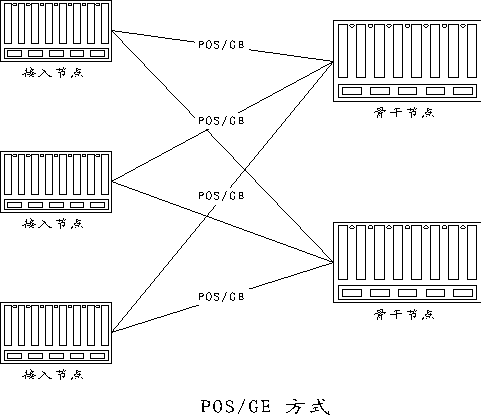 北京電信公眾IP網(wǎng)的接入節(jié)點與骨干節(jié)點之間的連接根據(jù)線路和帶寬的要求采用Packet Over SDH和千兆位以太網(wǎng)技術(shù)。