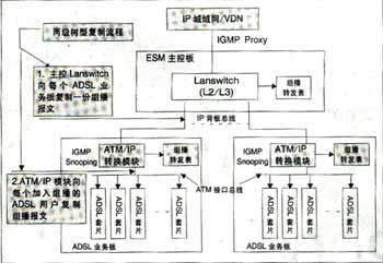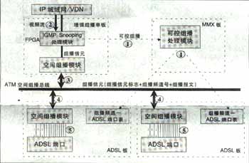 可實現(xiàn)高效的兩級組播;诳臻g總線上的組播信元技術實現(xiàn),與組播用戶數(shù)無關,同一節(jié)目即使所有用戶加入該頻道,僅需復制一份,不用逐個用戶復制到每個用戶端口,極大節(jié)省了背板帶寬,減輕IP上行負擔?蓪崿F(xiàn)高性能硬件組播轉發(fā)。IP上行板采用超大規(guī)模FPGA硬件邏輯處理組播報文,ADSL板采用空間組播處理硬件芯片自動完成向每個ADSL端口(用戶)的組播復制,每ADSL端口組播帶寬6M。