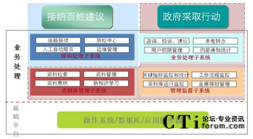 在架構(gòu)設(shè)計(jì)上,從電話接入、辦件流程、資料庫管理、信息維護(hù)到報(bào)表統(tǒng)計(jì)都實(shí)現(xiàn)了一體化設(shè)計(jì)理念。以業(yè)務(wù)流程設(shè)計(jì)為例,針對市民來電中的咨詢類的問題,12345政府熱線將直接由前臺(tái)接聽人員利用各部門預(yù)先錄入資料庫中的規(guī)范答案來回答市民的提問;對市民反映、建議、投訴類的來電,則由前臺(tái)記錄后轉(zhuǎn)給市信訪辦的后臺(tái)工作人員處理。一整套開放性的工作流和穩(wěn)定的技術(shù)后臺(tái)支持確保了市民可以在規(guī)定的時(shí)間內(nèi)得到政府的權(quán)威處理與回復(fù)。