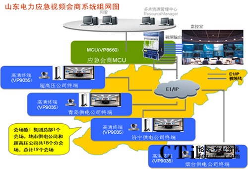 山東電力集團公司為了開展應急視頻會商業(yè)務,需建設(shè)一套覆蓋集團總部、地市供電公司、超高壓公司等19個單位的視訊系統(tǒng),并能夠與國家電網(wǎng)、地市供電公司已有系統(tǒng)實現(xiàn)音、視頻的互通。