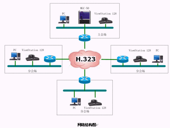 結(jié)合遼寧省消防網(wǎng)絡,本方案設計的視頻會議系統(tǒng)承載在遼寧省消防局的IP網(wǎng)絡平臺上,采用國際流行的ITU H.323通信標準。系統(tǒng)采用以MCU為中心輻射各個會場電視會議終端的星型網(wǎng)絡結(jié)構(gòu)。整套系統(tǒng)由16個會場組成,采用美國Polycom公司的ViewStation 128會議室型終端設備。網(wǎng)管中心安放一臺Polycom 公司的MGC-50(多點會議控制單元),用于對全網(wǎng)終端的控制,實現(xiàn)多點、點對點的會議。