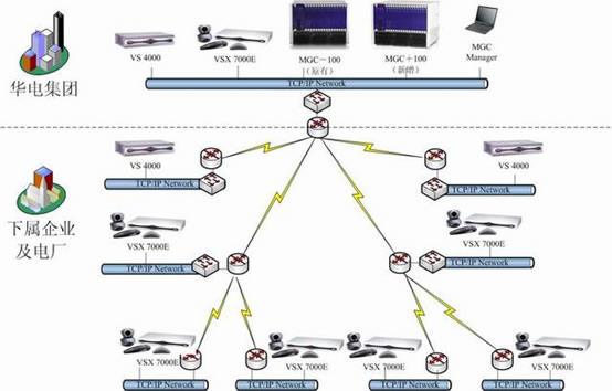 華電集團(tuán)領(lǐng)導(dǎo)十分重視電力信息化及華電集團(tuán)電子政務(wù)的建設(shè)工作。為了貫徹國務(wù)院對(duì)政府系統(tǒng)信息化建設(shè)的要求,實(shí)現(xiàn)華電集團(tuán)政務(wù)辦公和行業(yè)管理信息服務(wù)的電子化、網(wǎng)絡(luò)化,滿足華電集團(tuán)建立辦事高效、運(yùn)轉(zhuǎn)協(xié)調(diào)、行為規(guī)范的行政管理體制的要求,加快推進(jìn)電力行業(yè)信息化建設(shè),華電集團(tuán)決定開展華電集團(tuán)信息化建設(shè)二期工程建設(shè),即在現(xiàn)有的基礎(chǔ)上再增加一臺(tái)MCU以及在下屬企業(yè)及電廠增加37臺(tái)終端。鑒于POLYCOM在視頻會(huì)議強(qiáng)大的技術(shù)優(yōu)勢(shì)以及神州數(shù)碼在視頻會(huì)議系統(tǒng)建設(shè)和實(shí)施上的雄厚實(shí)力和豐富經(jīng)驗(yàn),華電集團(tuán)決定包括MCU和終端的所有設(shè)備都采用POLYCOM的產(chǎn)品。整個(gè)系統(tǒng)主要建立在華電集團(tuán)現(xiàn)有的視頻會(huì)議的基礎(chǔ)之上,依據(jù)H.323標(biāo)準(zhǔn)協(xié)議建設(shè)視頻會(huì)議系統(tǒng)二期組網(wǎng)。其中,控制中心新增一臺(tái)POLYCOM公司的MGC+100多點(diǎn)控制單元(即MCU);POLYCOM 高性能的VSX7000E作為下屬企業(yè)及電廠主接點(diǎn)視頻會(huì)議終端。