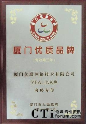 CTI論壇(ctiforum)3月4日消息(記者 潘婷婷): 2011年3月3日,中國最佳IP話機(jī)提供商,暢銷歐美IP通信終端市場—億聯(lián)公司(Yealink)旗下全系列產(chǎn)品近日被廈門市政府授予2010年“廈門市優(yōu)質(zhì)品牌”稱號,為Yealink品牌建設(shè)添上了重要的一筆。