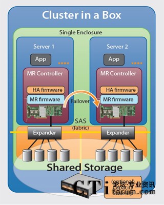 SAS 控制器對每個主板實現(xiàn)集群化,同時為兩部服務(wù)器提供冗余存儲連接功能。