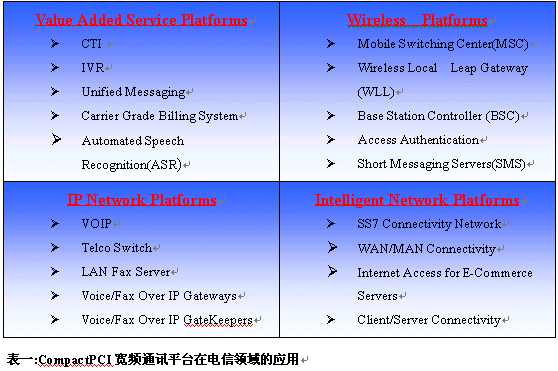 Messaging)、計費系統(tǒng)、地址服務(Location-based Service)、Internet存取服務等不勝枚舉。茲將常見CompactPCI在電信領(lǐng)域應用整理如下表: