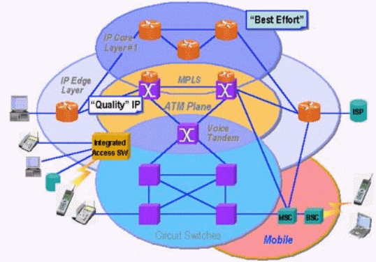 不同的網(wǎng)將按各自的最佳方向獨立演進,融合發(fā)展。最終形成一個統(tǒng)一的融合的主要是以IP為基礎的分組化網(wǎng)。如圖1所示。然而,從傳統(tǒng)的電路交換網(wǎng)到分組化網(wǎng)將是一個長期的漸進過渡過程,因而在今后20年甚至更長的時間兩種網(wǎng)絡將共存。