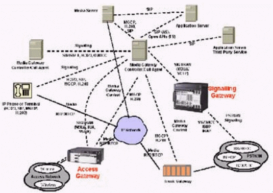 本例中的媒體網(wǎng)關控制器(MGC)終結所有的信令,包括直接傳輸?shù)暮屯ㄟ^IP的信令,完成如一個SIP電話向PSTN網(wǎng)絡發(fā)送信號之類的信令互通,還對打到VoIP網(wǎng)絡的呼叫進行鑒權和選擇路由,并提供計費信息。這個MGC還通過SIP/SIP-T,H.323或Q.BICC與其他的MGC通信。