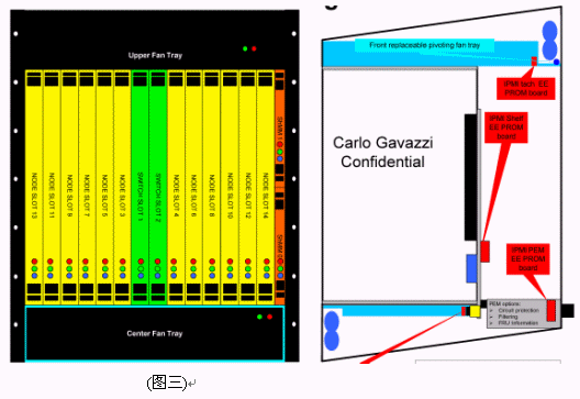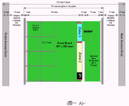 我們可以看到當今市面上已有相關的零件商或系統(tǒng)商開發(fā)出14U或13U,12U的ATCA機箱。就ATCA機箱的型式來說可以分為直立型插卡與橫向型插卡兩種類型。直立式插卡機箱的標準為14槽(參考圖一B),而橫向型機箱因受限于機箱高度,所以視其高度決定槽數(shù)的多少。 ATCA的架構主要包括以下部分:正面插槽,RTM,PEM,背板,CMMs,散熱系統(tǒng)。(參考圖一與圖二)