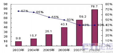 圖1-1 2004-2008年中國(guó)BSM軟件市場(chǎng)規(guī)模與增長(zhǎng)趨勢(shì)數(shù)據(jù)(數(shù)據(jù)來(lái)源:賽迪顧問(wèn))