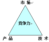 企業(yè)要發(fā)展, 關(guān)鍵于企業(yè)的核心競(jìng)爭(zhēng)力, 企業(yè)如何具有核心競(jìng)爭(zhēng)力, 特別是通信企業(yè), 我認(rèn)為, 通信企業(yè)要具有核心競(jìng)爭(zhēng)力, 決定于三個(gè)因素: 市場(chǎng), 產(chǎn)品, 技術(shù). 這三個(gè)因素構(gòu)筑企業(yè)強(qiáng)大競(jìng)爭(zhēng)力---競(jìng)爭(zhēng)力三角型. 三角型的邊則是產(chǎn)品經(jīng)理的活動(dòng)軌道. 圖1-1