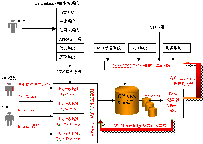 利用PowerCRM的銀行分析型CRM解決方案,對(duì)客戶信息進(jìn)行全面的分析,從而挖掘出許多客戶知識(shí),繼而制定和改進(jìn)相應(yīng)的市場策略,應(yīng)用于PowerCRM運(yùn)營型CRM系統(tǒng)中,更好地指導(dǎo)營銷人員為客戶服務(wù)和完善客戶服務(wù)流程;同時(shí)也需要反饋到銀行內(nèi)部系統(tǒng),用于增強(qiáng)銀行內(nèi)部的運(yùn)營效率。