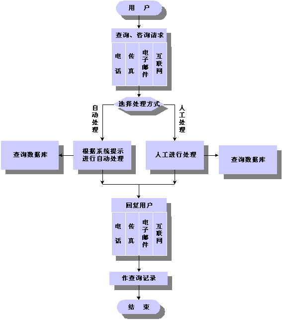 如:可開展信息咨詢業(yè)務(wù),為患者提供具體企業(yè)、事業(yè)單位的信息查詢,包括企業(yè)介紹、產(chǎn)品服務(wù)介紹、價(jià)格、功能、銷售地點(diǎn)、聯(lián)系電話、服務(wù)流程、辦事程序等。實(shí)現(xiàn)的方式包括口頭咨詢、語音服務(wù)、傳真服務(wù)、E-Mail等。系統(tǒng)對患者咨詢的反饋方式有:電話通知、傳真通知、人工回答、電子郵件。