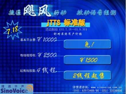 2003年7月18日,北京捷通華聲語音技術(shù)有限公司正式發(fā)布捷通華聲語音合成技術(shù) “jTTS標(biāo)準(zhǔn)版”。為慶祝“jTTS標(biāo)準(zhǔn)版”的正式上市,為期近三個(gè)月,推廣“jTTS標(biāo)準(zhǔn)版”的捷通“颶風(fēng)行動”也在同一時(shí)間正式啟動! 捷通“颶風(fēng)行動”的宗旨--用全新的產(chǎn)品、全方位的服務(wù)、最具競爭力的價(jià)格與所有CTI領(lǐng)域的企業(yè)合作,開啟面向中小型CTI系統(tǒng)語音應(yīng)用的市場大門,為CTI產(chǎn)業(yè)發(fā)展提供持久動力支持!