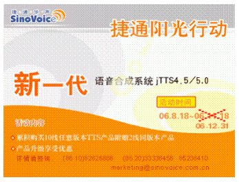 2006年8月18日,捷通華聲正式發(fā)布新一代語音合成系統(tǒng)jTTS4.5,同時(shí)啟動(dòng)了為期三個(gè)月的“陽光行動(dòng)”。行動(dòng)一經(jīng)推出,立即引起了強(qiáng)烈的市場反響。每日致電(86-10)82826886咨詢jTTS4.5產(chǎn)品及價(jià)格詳情的客戶接連不斷,通過訪問捷通華聲語音合成在線演示系統(tǒng)http://www.sinovoice.com.cn/2-e-1.asp或者撥打24小時(shí)產(chǎn)品演示熱線(86-10)82826886-8624體驗(yàn)合成效果自然度和流暢度的用戶絡(luò)繹不絕,定購產(chǎn)品享受累積購買10線任意版本TTS附贈2線同版本產(chǎn)品等優(yōu)惠政策的合作伙伴更是紛至沓來。大家都對jTTS4.5的新增甜美音色大加贊賞,更對jTTS4.5合成效果自然度和流暢度的提升給予了極大的肯定及滿意,同時(shí)表達(dá)出希望能延長活動(dòng)時(shí)間的誠懇建議。為答謝新老客戶對捷通產(chǎn)品的關(guān)注與厚愛,捷通公司特決定將“陽光行動(dòng)”活動(dòng)時(shí)間延期至12月31日。