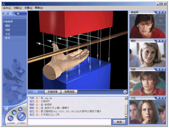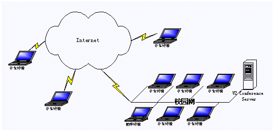 應用V2 遠程教育平臺,教學和遠程培訓都可以在線進行。學生和教師利用各自的客戶端通過網(wǎng)絡,進入一個虛擬課堂,在教師與學生、學生與學生之間建立起語音和視頻的雙向交流、課件教學、在線會話和白板溝通的環(huán)境,實現(xiàn)教學功能。