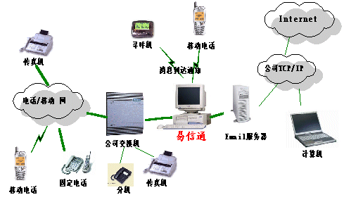 當(dāng)你出差在外,剛剛返回,你想查一下你在公司里的Email、傳真或者有什么重要的留言,于是你打開手機(jī),撥了一個(gè)電話,接入了你的公司的易信通系統(tǒng),在里面聽到了你想要的所有信息,然后你把它們分門別類,按照緊急程度,先后處理。