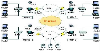 3.系統(tǒng)內(nèi)用戶發(fā)送傳真說明:集團A區(qū)的用戶如果發(fā)送本地傳真,則在集團A區(qū)的e-FAX網(wǎng)絡(luò)傳真機收到任務(wù)請求后,通過本地的PSTN網(wǎng)絡(luò)發(fā)送傳真,傳真發(fā)送成功后,系統(tǒng)自動給發(fā)送人一份傳真通報,發(fā)送完成;集團A區(qū)的用戶如果發(fā)送外地傳真,例如發(fā)送到集團D區(qū),集團A區(qū)的e-FAX網(wǎng)絡(luò)傳真機會自動根據(jù)收到的任務(wù)請求信息進行判斷,根據(jù)判斷的信息,將發(fā)送傳真請求和相應(yīng)的傳真文件通過Internet路由到集團D區(qū)的e-FAX網(wǎng)絡(luò)傳真機,集團D區(qū)的網(wǎng)絡(luò)傳真機收到訊息后,會自動通過本地的PSTN發(fā)送傳真任務(wù),發(fā)送結(jié)果會自動通報到集團A區(qū)的發(fā)送人,發(fā)送完成。同理,在集團的其他區(qū)域內(nèi)的發(fā)送傳真請求都會自動路由,判斷發(fā)送方式,從而完成發(fā)送任務(wù)。