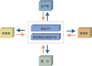 讓我們看看這樣一個(gè)應(yīng)用,以固定網(wǎng)綜合信息平臺(tái)為基本支撐平臺(tái),以“虛擬ICP”為業(yè)務(wù)承載平臺(tái),包含了銷售商、生產(chǎn)商、供應(yīng)商、消費(fèi)用戶,形成了一個(gè)初步完整供應(yīng)鏈系統(tǒng),如圖所示。