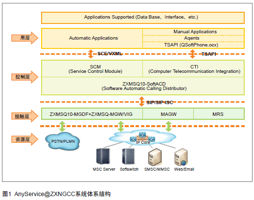 中興通訊AnyService@ZXNGCC多媒體統(tǒng)一接觸中心系統(tǒng)以中興通訊ZXMSQ10多媒體軟排隊(duì)機(jī)系統(tǒng)為基礎(chǔ),基于軟交換技術(shù)。ZXMSQ10由接入網(wǎng)關(guān)和軟排隊(duì)機(jī)兩個核心部件組成,語音、視頻呼叫(呼入和呼出)通過ZXMSQ10多媒體軟排隊(duì)機(jī)匯聚到AnyService@ZXNGCC系統(tǒng),其他媒體通過MAGW接入到NGCC系統(tǒng),同時AnyService@ZXNGCC也選擇最佳的媒體類型將信息主動反饋給用戶,形成雙向溝通的渠道,實(shí)現(xiàn)呼叫中心系統(tǒng)的被動服務(wù)和主動服務(wù)。