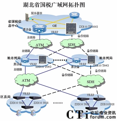 湖北省國稅三級專網(wǎng)已經(jīng)建成,但是存在單點單鏈路隱患,為了保證網(wǎng)絡(luò)可靠運行,2006年湖北國稅攜手中興通訊對省國稅系統(tǒng)的網(wǎng)絡(luò)進(jìn)行備份網(wǎng)絡(luò)改造,結(jié)合稅務(wù)系統(tǒng)金稅三期網(wǎng)絡(luò)需求,網(wǎng)絡(luò)改造采用SDH線路來組建高帶寬的廣域網(wǎng)絡(luò),同時與原有的網(wǎng)絡(luò)設(shè)備(包括路由器、交換機)及網(wǎng)絡(luò)接入設(shè)備實現(xiàn)互連互通,互為備份。